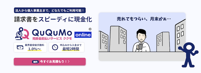 QuQuMo(ククモ)のような「オンライン完結型」のサービスです。彼らはAI審査を導入し、人件費や店舗コストを極限まで削っているため、2社間ファクタリングでありながら「1%〜」という圧倒的な安さを実現しています。