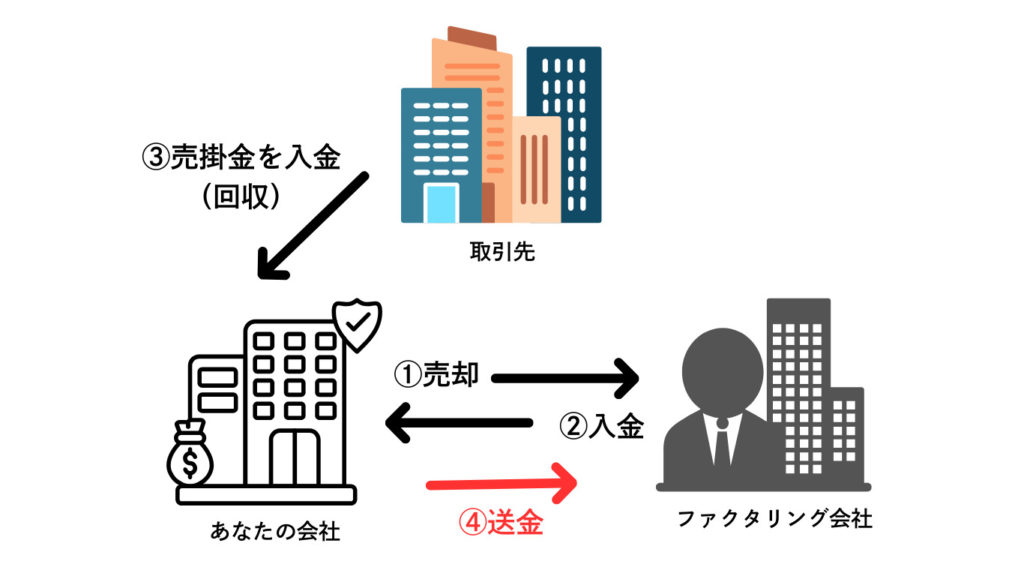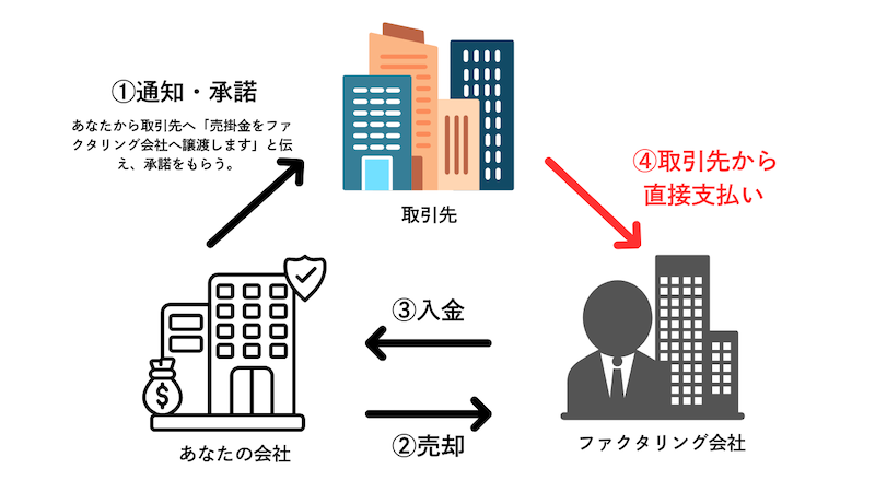 - 直接回収: 期日が来たら、取引先は直接ファクタリング業者へ代金を支払う。