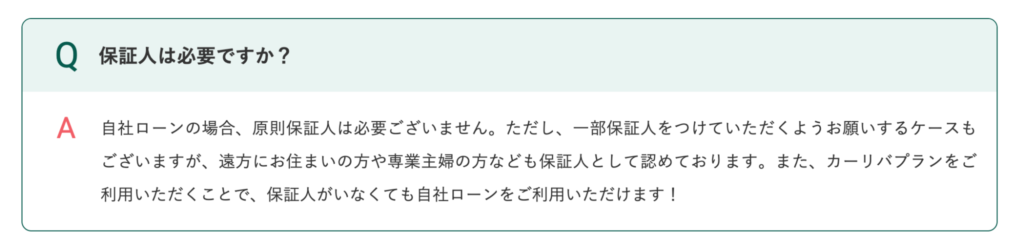 しかし、近年、一部の大手自社ローン専門店では、「保証人不要プラン」がスタンダードになりつつあります。たとえば、カーリバは、保証人を原則必要としません。